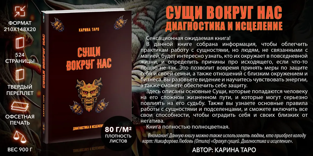 Здесь описаны основные Сущи, которые попадаются человеку на его сложном жизненном пути, и которые могут серьезно повлиять на его судьбу. Также вы узнаете основные правила работы с сущностями и подселенцами, и сможете включить все свои способности, чтобы оградить себя и своих близких от негатива.
